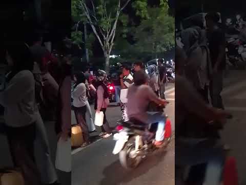 Di SPBU Ulelheu antrian BBM oleh kenderaan sudah mencapai satu kilo meter. Usai Shalat Isya, ditambah antrian ratusan warga yang membawa jerigen minyak.